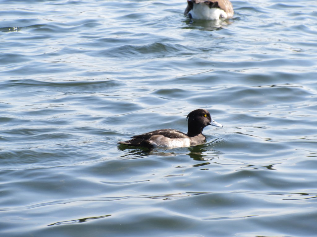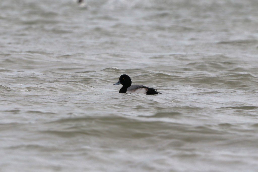 Male Tufted Ducks are the easiest to identify. The key difference to look out for is the ponytail-like tuft of feathers that protrudes from the back of the head, but this can be difficult to judge at a distance amongst a large raft of Scaups, or when the head is tucked in while sleeping. The second key field mark is the colour of the back; Tufted ducks have a dark black back while Scaups sport more of a gradient, compare the below photo of a Greater Scaup with the photo of the Tufted Duck from earlier: